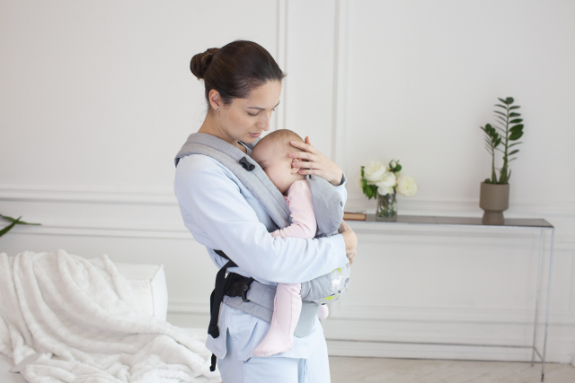 縦抱きタイプの抱っこ紐を使用する場合も、装着位置が重要になります。赤ちゃんの位置が低すぎると、前に引っ張られる形になって腰が反ってしまいます。理想的な位置は、赤ちゃんの頭にキスができるくらいの高さです。
