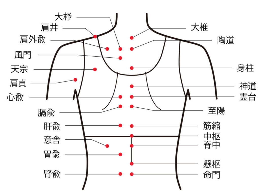肩甲骨の周りには肩こりや背中の痛みに効くとされるツボがいくつもあります。東洋医学では経絡という気の流れに沿ってツボが配置されていて、適切に刺激することで血流を改善したり筋肉の緊張を和らげたりする効果が期待できるんです。ここでは代表的なツボをいくつかご紹介しますね。